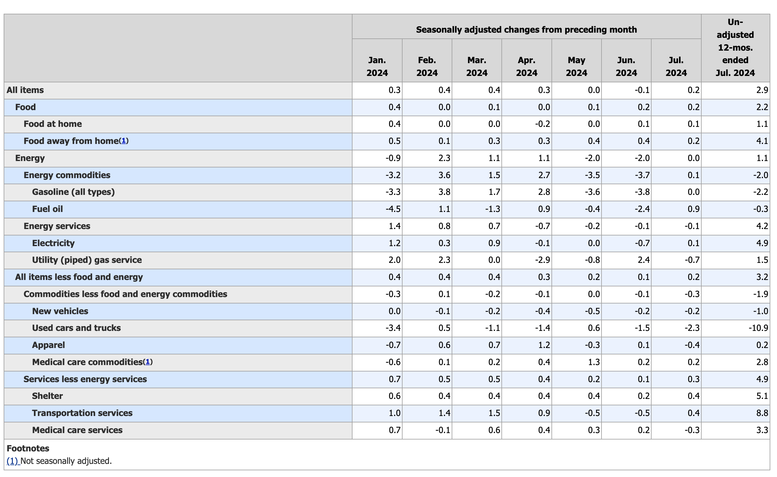 The all items index rose 2.9 percent for the 12 months ending July, the smallest 12-month increase since March 2021. The all items less food and energy index rose 3.2 percent over the last 12 months and was the smallest 12-month increase in that index since April 2021. The energy index increased 1.1 percent for the 12 months ending July. The food index increased 2.2 percent over the last year.