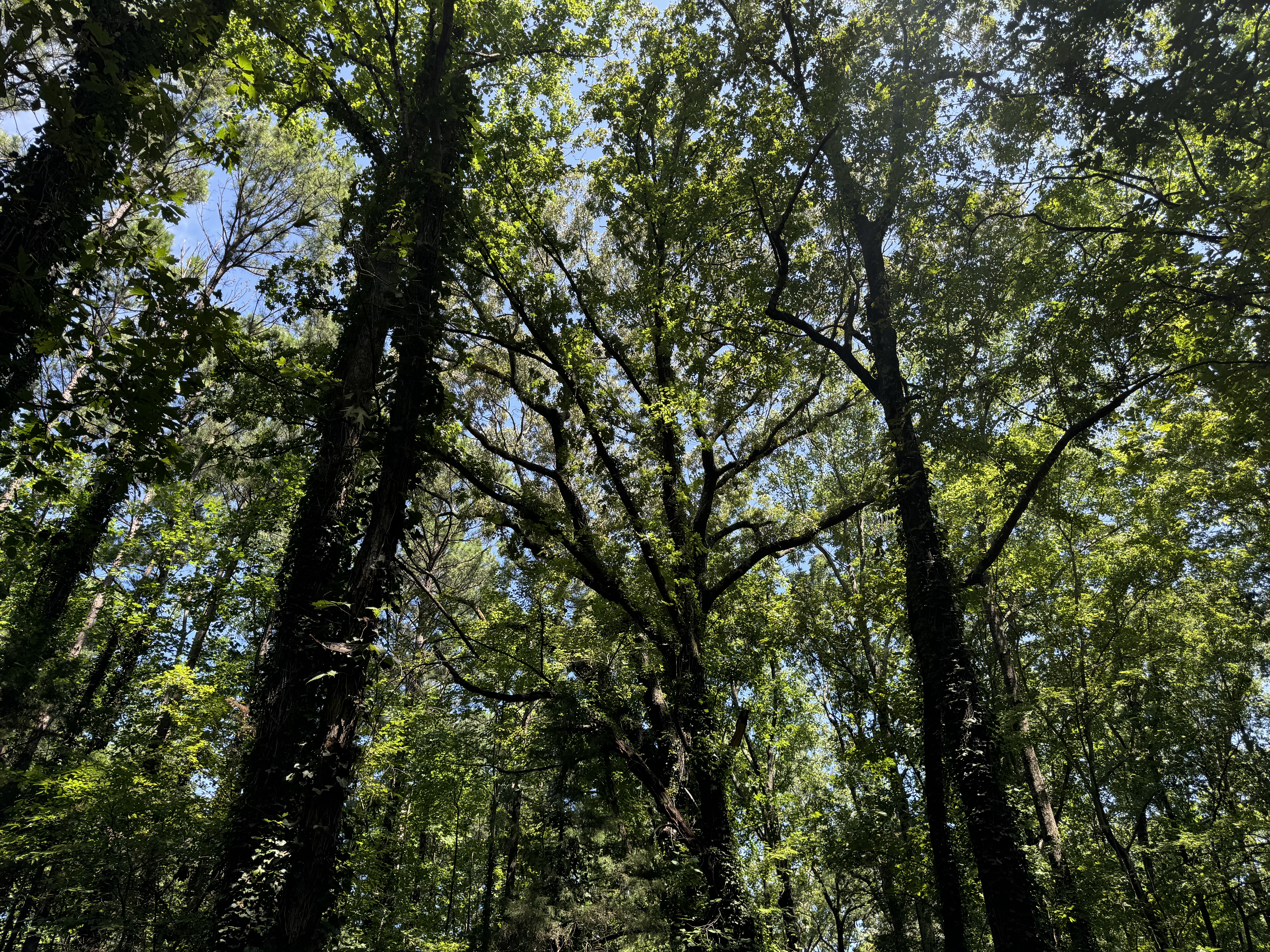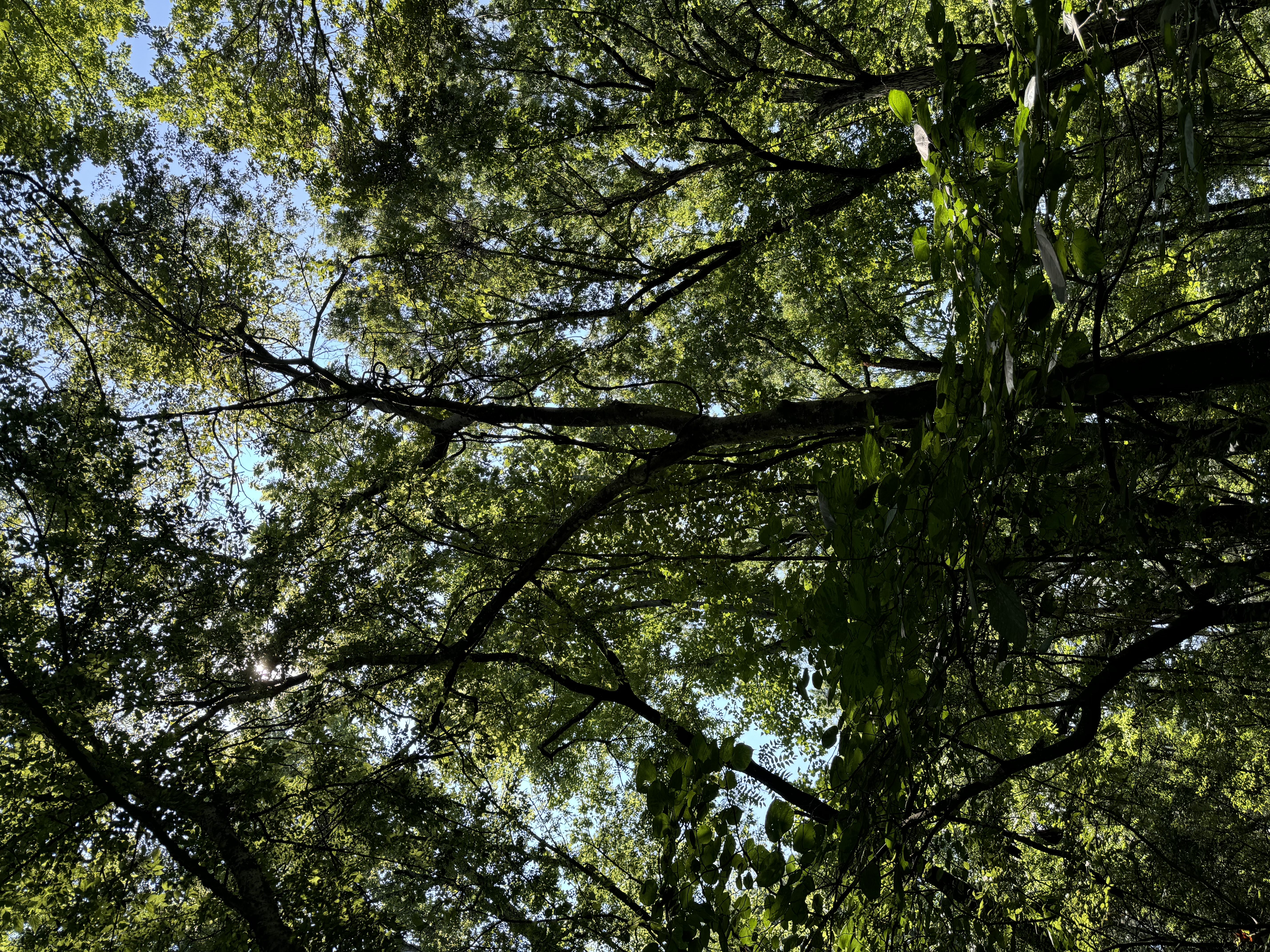 The dead tree was my favorite shot. The area where I was walking was very lush and green and then there was a sudden clearing in the treetops (I guess because the dead tree had lost so many branches and all of its leaves). The juxtaposition of the dead tree on a clear blue sky with orange fungi doing their work against the shaded green forest was just so striking.