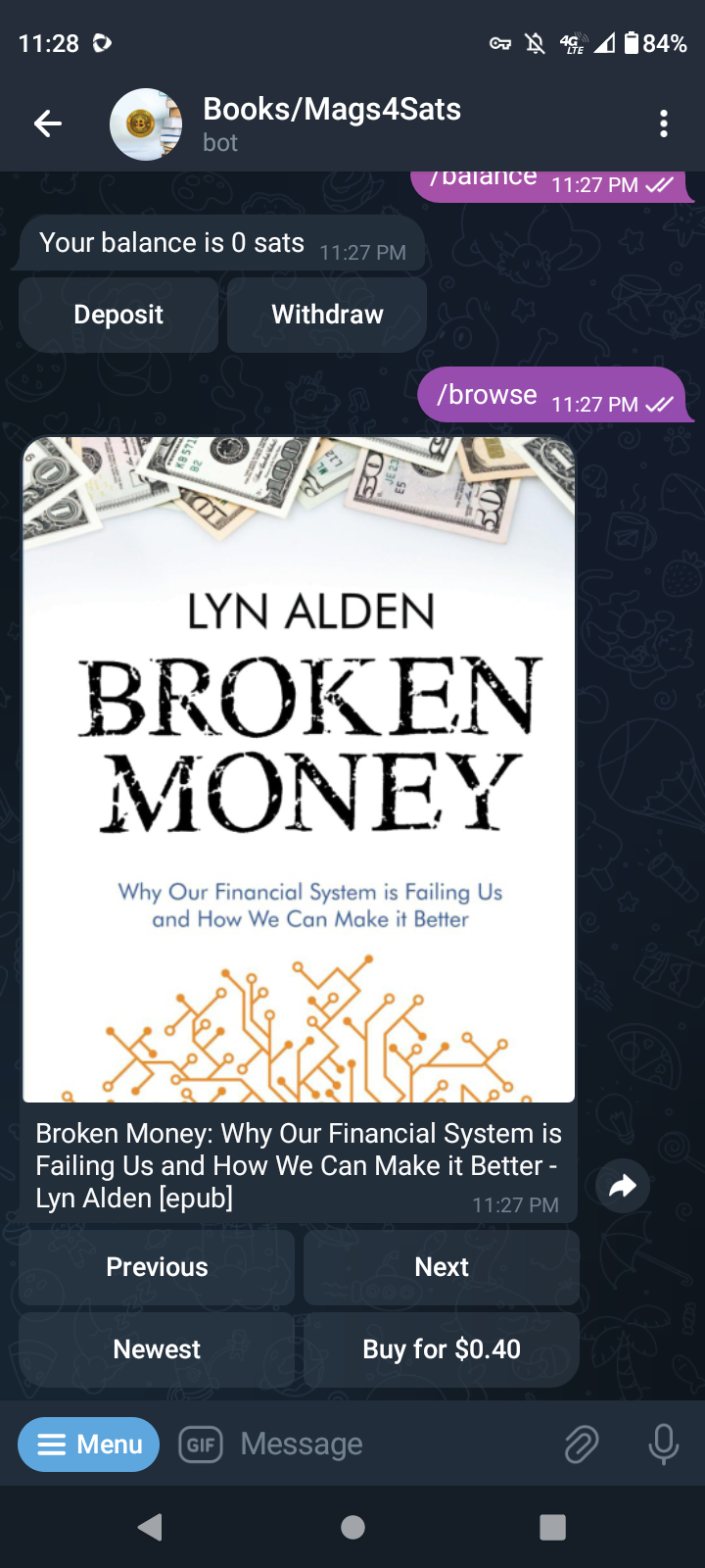 I forgot this service/bot existed until I re-discovered it today. This service via a telegram bot allows you to buy books and magazines for sats! Although the price of the books are in fiat USD, the only currency the bot accepts is sats.