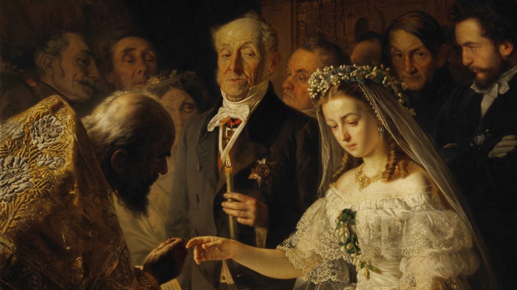 The painting "Unequal Marriage" by Vasily Pukirev (1862) depicts a wedding scene inside a Russian Orthodox church. The painting serves as a powerful critique of 19th-century Russian society, where arranged marriages, often driven by social and economic reasons, were very common.