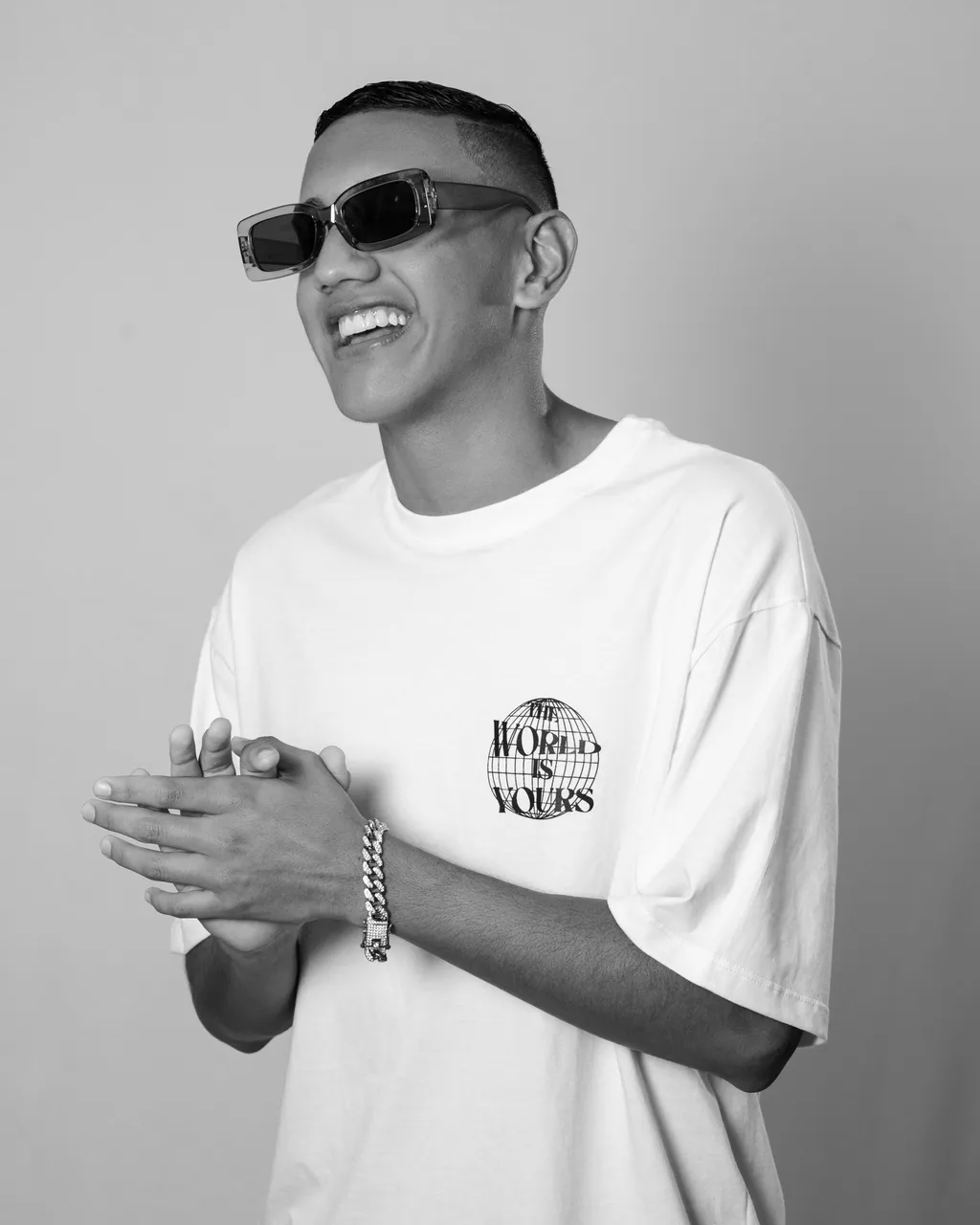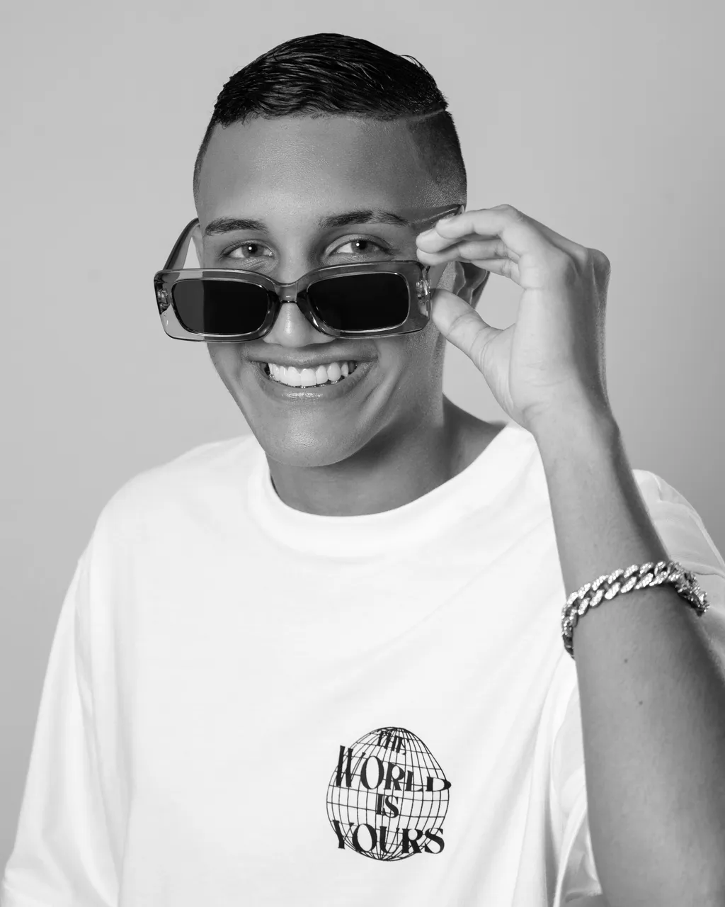 The concept for the photoshoot was 'fashion,' so we started there, with a photo of him wearing some glasses, a very cool accessory in the fashion world