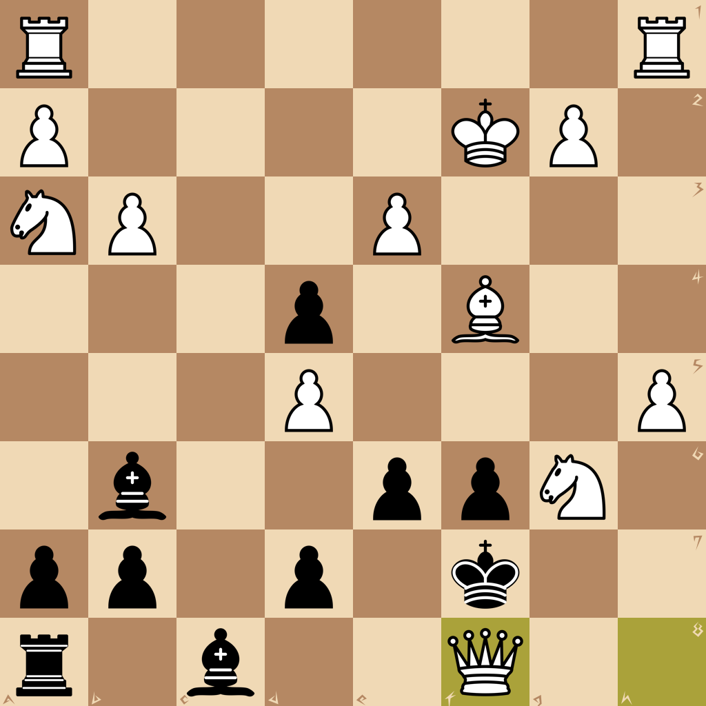 1.h3 e6 2.b3 Qf6 3.c3 Bc5 4.d4 Bb6 5.Nf3 c5 6.Bg5 Qg6 7.e3 Nf6 8.Bd3 Ne4 9.h4 f6 10.h5 Qf5 11.Bf4 Nc6 12.Nh4 Nf2 13.Kxf2 Qd5 14.c4 Ne5 15.cxd5 cxd4 16.Na3 Ng4+ 17.Qxg4 g6 18.Bxg6+ hxg6 19.Qxg6+ Ke7 20.Qg7+ Kd8 21.Qxh8+ Ke7 22.Ng6+ Kf7 23.Qf8#
